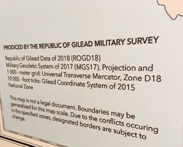 I am a geographer who works with Geographic Information Systems (GIS) in my day job and became interested in knowing how much territory is under Gilead’s control. There are off-hand comments in character’s day-to-day conversations about “the war” going well, Florida or California being part of Gilead…etc, but Gilead is a closed, totalitarian society and the audience has no reason to trust these claims, they could just be propaganda. While watching one of the episodes one scene caught my geographer’s eye that I figured could help me contextualize the world with Gilead a little more with my own.