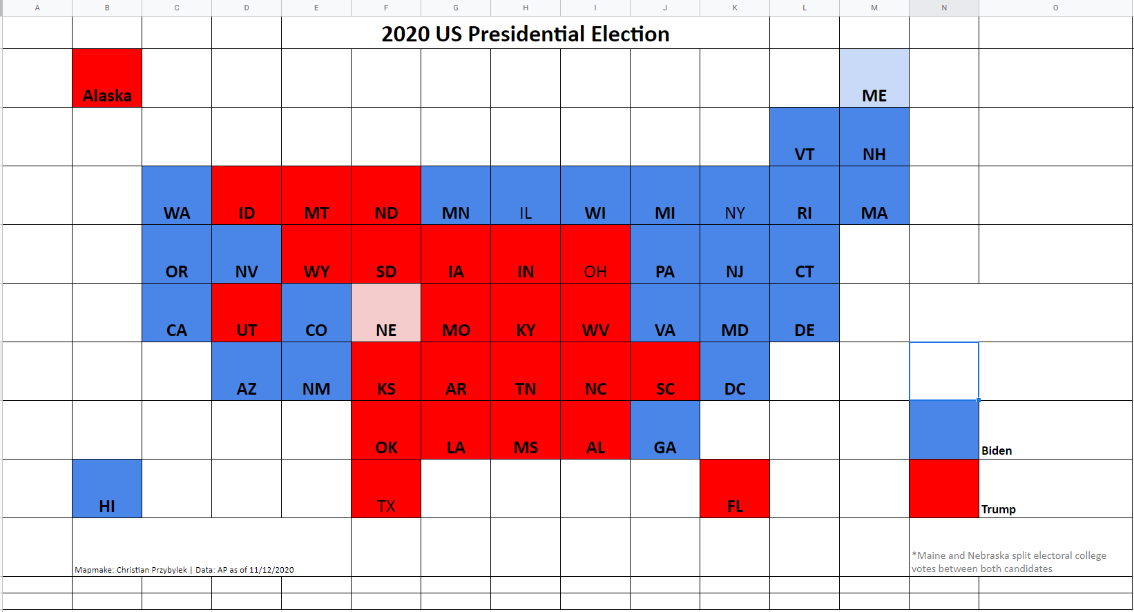 30 Day Map Challenge 2020: Day 12 30 Day Map Challenge Nov 12 Written By Christian Przybylek Day 12: Map Not Made With GIS SoftwareSubject: 2020 Presidential Election Tools: Google Spreadsheets View fullsize 2020 ElectionGoogle SpreadsheetsMapsPolitical Map#30DayMapChallenge Christian Przybylek