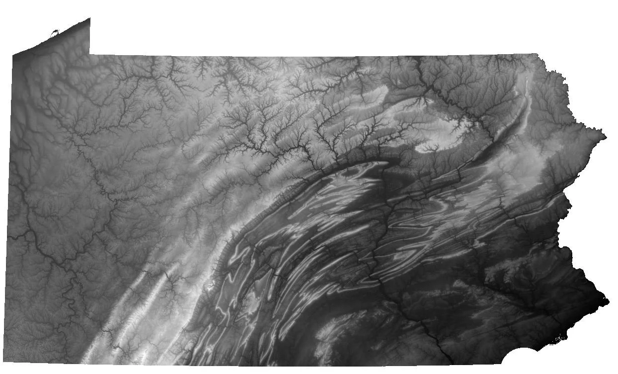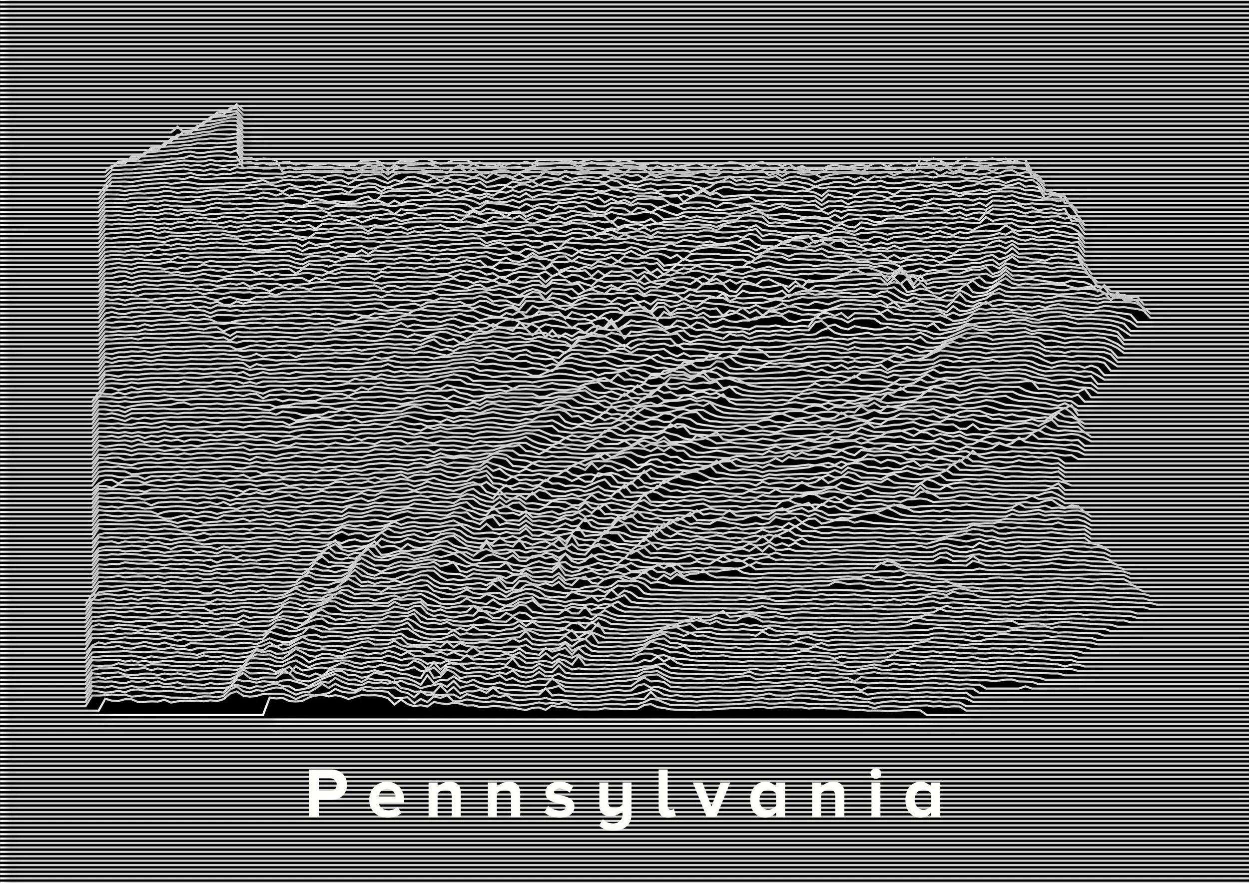 For day 2 of the #30DayMappingChallenge my theme is lines. The theme’s broadness makes choosing a subject difficult. There are a considerable number of worthy line datasets and subjects (rail lines, shipping routes, trails…etc) that could have worked for this, , but I decided to repeat a classic, and landed on making a Topographic Joy Plot map of Pennsylvania. This style of map uses lines to depict elevation change/topography and statistical data, like population density. This technique produces a modern looking minimalist style map, though this cartographic technique isn’t exactly new. It was re-popularized by the punk band, Joy Division by their release of their 1979 Unknown Pleasures album (it’s a killer album).
