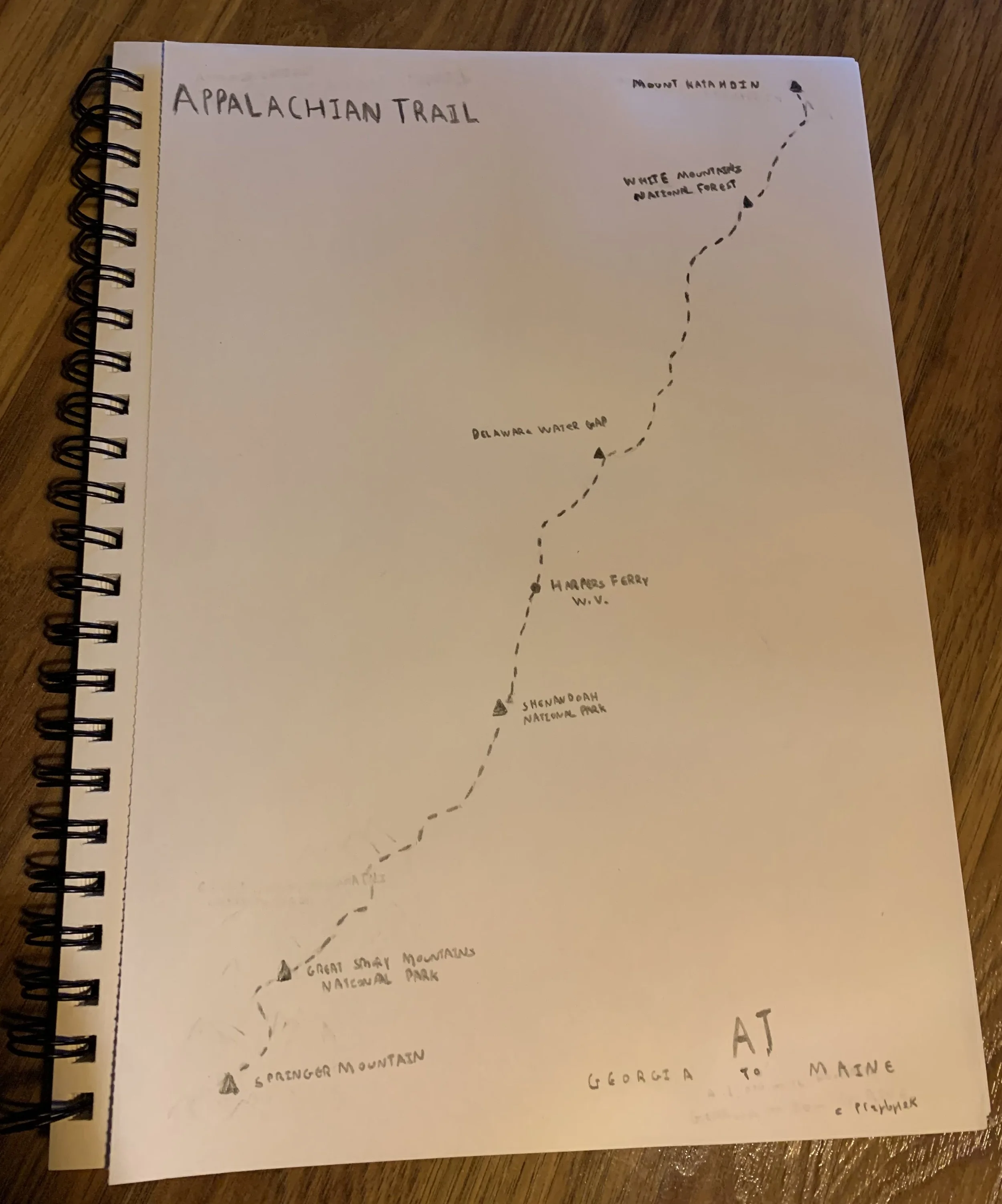 For my tools, I used a sketch pad, some drawing pencils, and an eraser. I decided to keep it simple. I loosely referred to a map of the AT that I have on my wall to sketch out the path of the trail and decided to add Springer Mountain and Mount Katahdin, the AT’s southern and northern terminuses and filled in some interesting spots in between. My map is below.